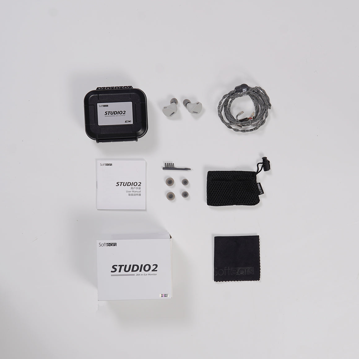 1. Softears Studio2 (Demo Unit) 2. Earphone Cable * 1 3. Eartips 4. Clean Tool * 1 5. Storage Bag * 1 6. Storage Case * 1 7. User Manual * 1